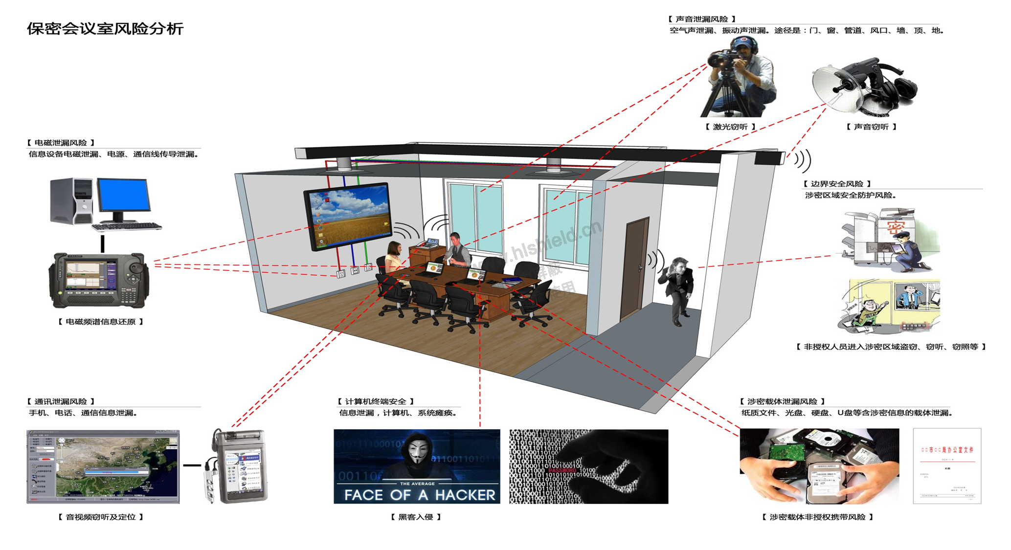 目前,隨著黨政機關、科研機構、國防軍工和國有企業(yè)等單位的工作會議、技術交流、項目匯報、科研講座的增多,對現(xiàn)代視訊展示、數(shù)碼電聲處理、自動化電器處理等組成的多媒體聲、光、像會議系統(tǒng)和保密防護技術的需求越來越強烈。我們根據(jù)其實際應用和需求,依據(jù)國家保密標準BMB26-2012《保密會議室保密要求和測試方法》的規(guī)定,結合會議涉及的涉密信息等級,對重要區(qū)域采取先進的防護技術手段,我公司推出了保密會議室等重要區(qū)域的整體解決方案及系列專用產(chǎn)品,在功能和性能方面完全滿足各級保密部門不同密級的防護需求。